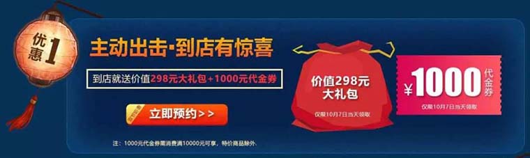 凡進店簽到的顧客,可領取一份價值298元大禮包+1000元現金代金券(注:僅限10月7日當天領取,1000元代金券需消費滿10000元可享,特價商品除外)。