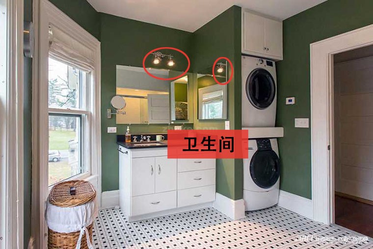 衛(wèi)生間的燈除了整體照明的吸頂燈以外,最好安裝兩個小的鏡前燈,這樣在洗臉或化妝的時候我們就可以看清啦,如下圖這樣。